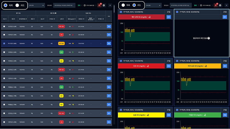 – 다양한 환자 실시간 ‘혈당 보기 모드’제공 – 카드형 · 목록형 · 환자 개별 보기 등 – 24시간 · 4일 · 목표 범위 밖 혈당 보기 등