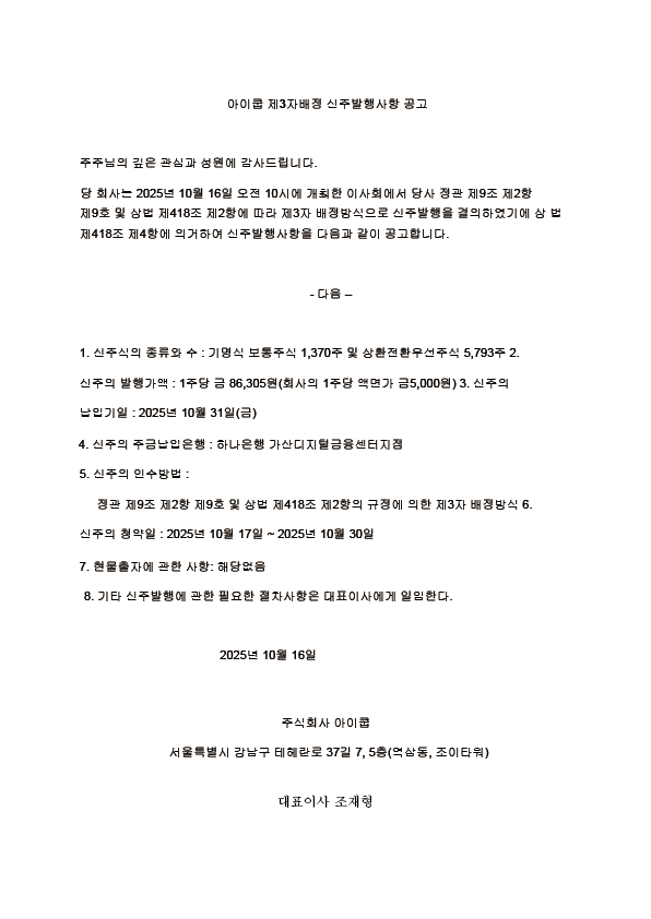 아이쿱 10월 제3자배정 신주발행사항 공고