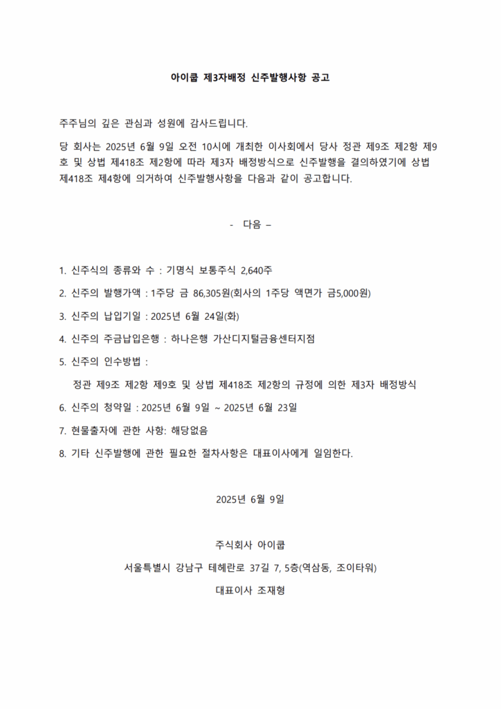 아이쿱 6월 제3자배정 신주발행사항 공고